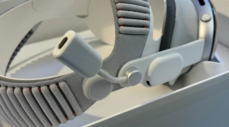 Vision Pro机身没有预留数据接口,假如开发者想要测试设备可以选择购买一个名为Apple Developer Strap的配件,使用时需要将设备的右音频带拆卸下来,然后再将这一配件安装上去,配件底部配备了一个USB-C接口。