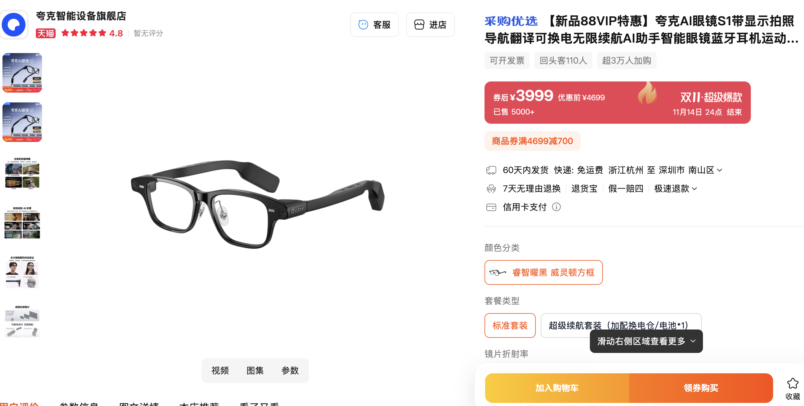 截至 11 月 10 日,天猫平台显示,夸克 AI 眼镜 S1 已售出 5000+。据悉,作为阿里首款 AI 眼镜,夸克 AI 眼镜 S1 从 10 月 24 日正式开启预售,产品将于 12 月初陆续发货。