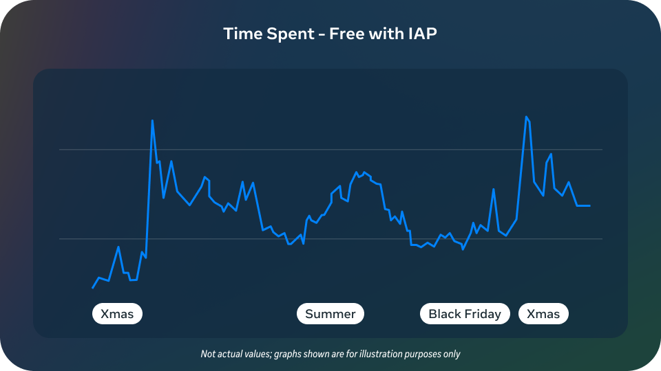 Meta表示,十余年行业趋势数据显示:北半球冬季假期期间用户时长显著增长,感恩节与圣诞节前后尤为明显。用户时长与权益增长高度相关,圣诞节后的两周堪称黄金期。下方图表显示了付费应用与含IAP功能的免费应用在用户时长分布上的差异。