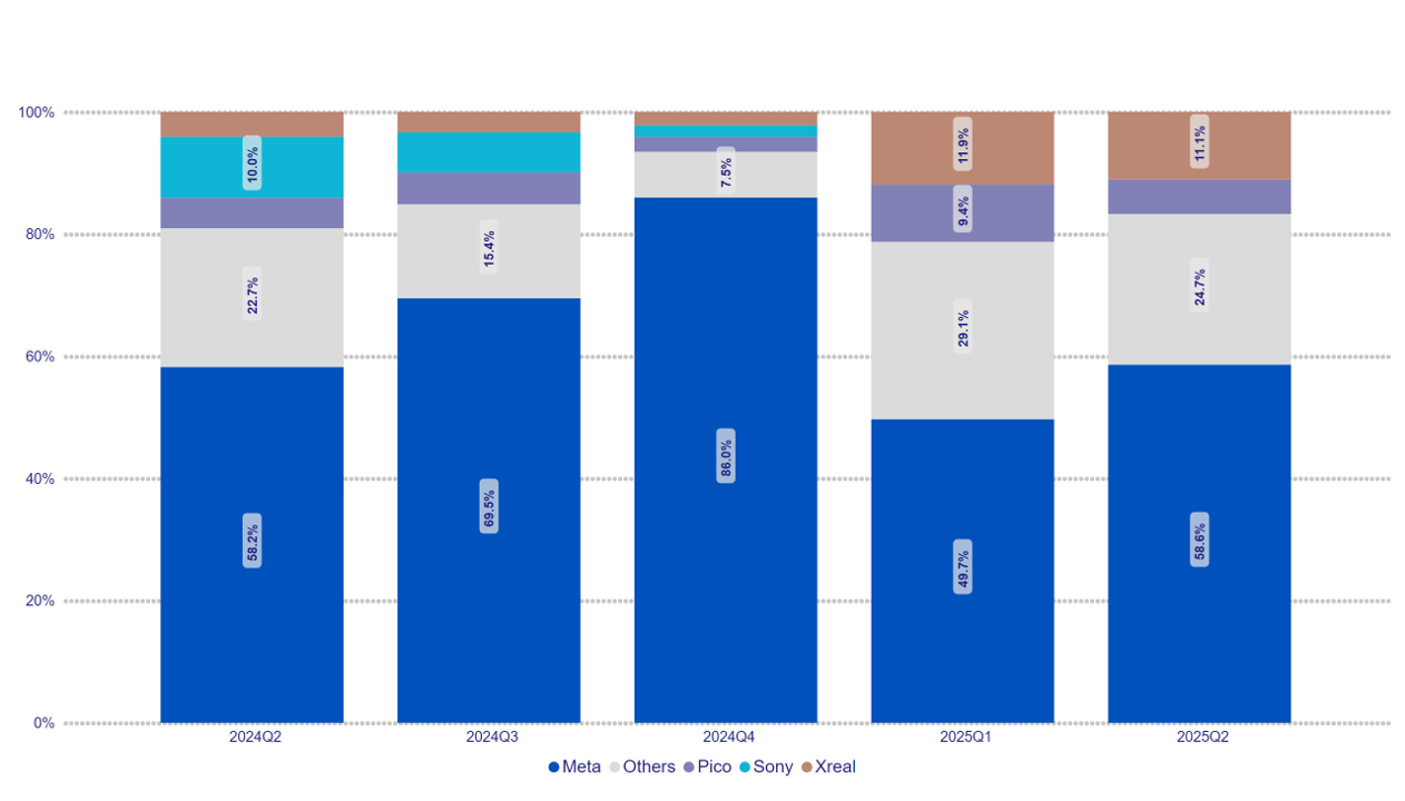 根据IDC近期发布的《2025年Q2季度AR和VR头显市场洞察》,Meta在硬件领域占据绝对领先地位,其在2025年第二季度占据了AR/VR与无显示屏智能眼镜合并市场的60.6%。该公司不仅凭借相对轻巧的机身设计在智能眼镜领域取得成功,更持续引领混合现实技术发展——这两个领域最终都将为未来真正的增强现实眼镜奠定基础。