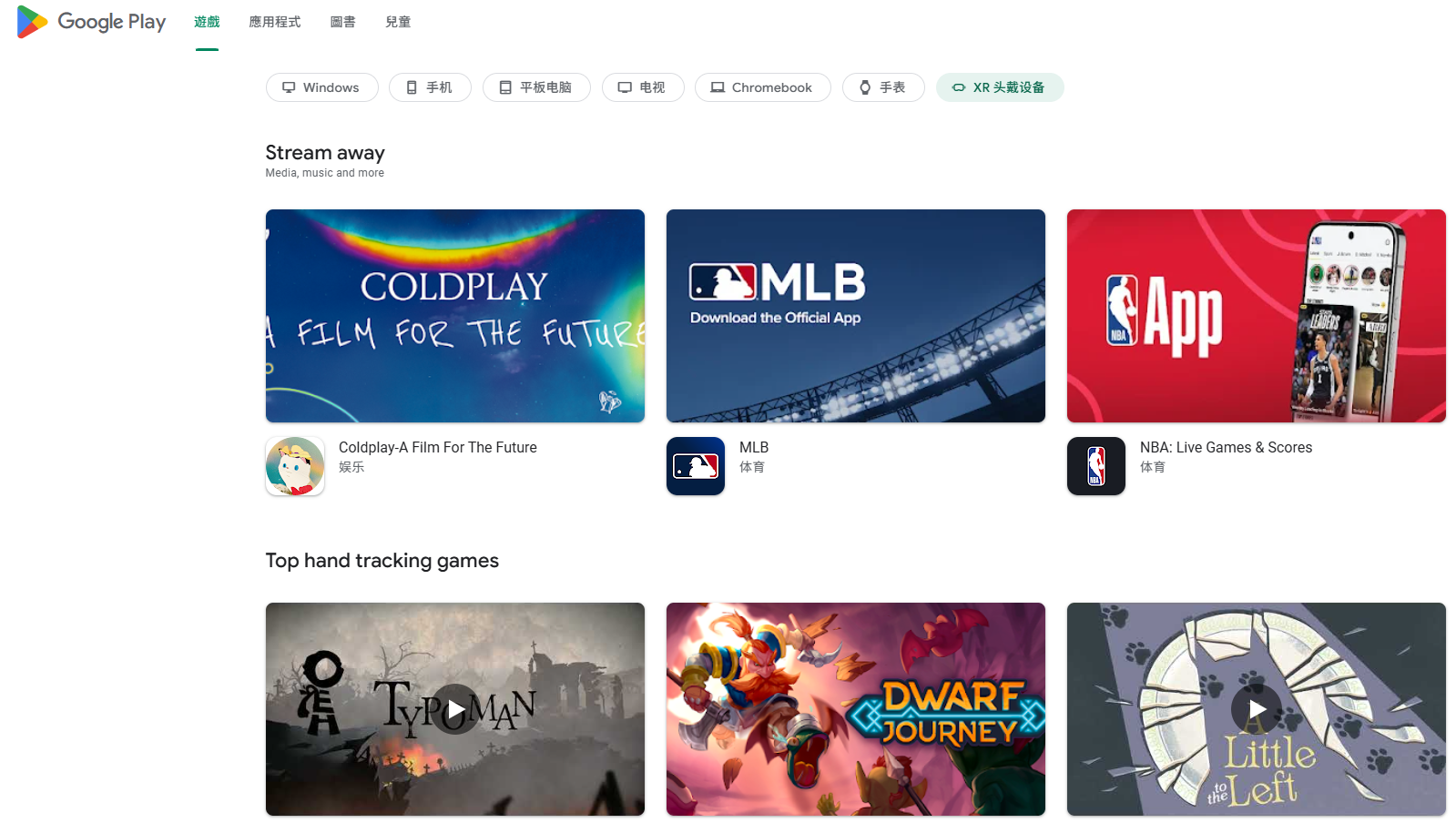 此次更新也延伸到了浏览体验:在“应用”和“游戏”选项卡下,“其他设备”筛选器现在包含一个专门的XR头戴式设备部分,从而更容易发现专为混合现实和VR环境设计的应用。