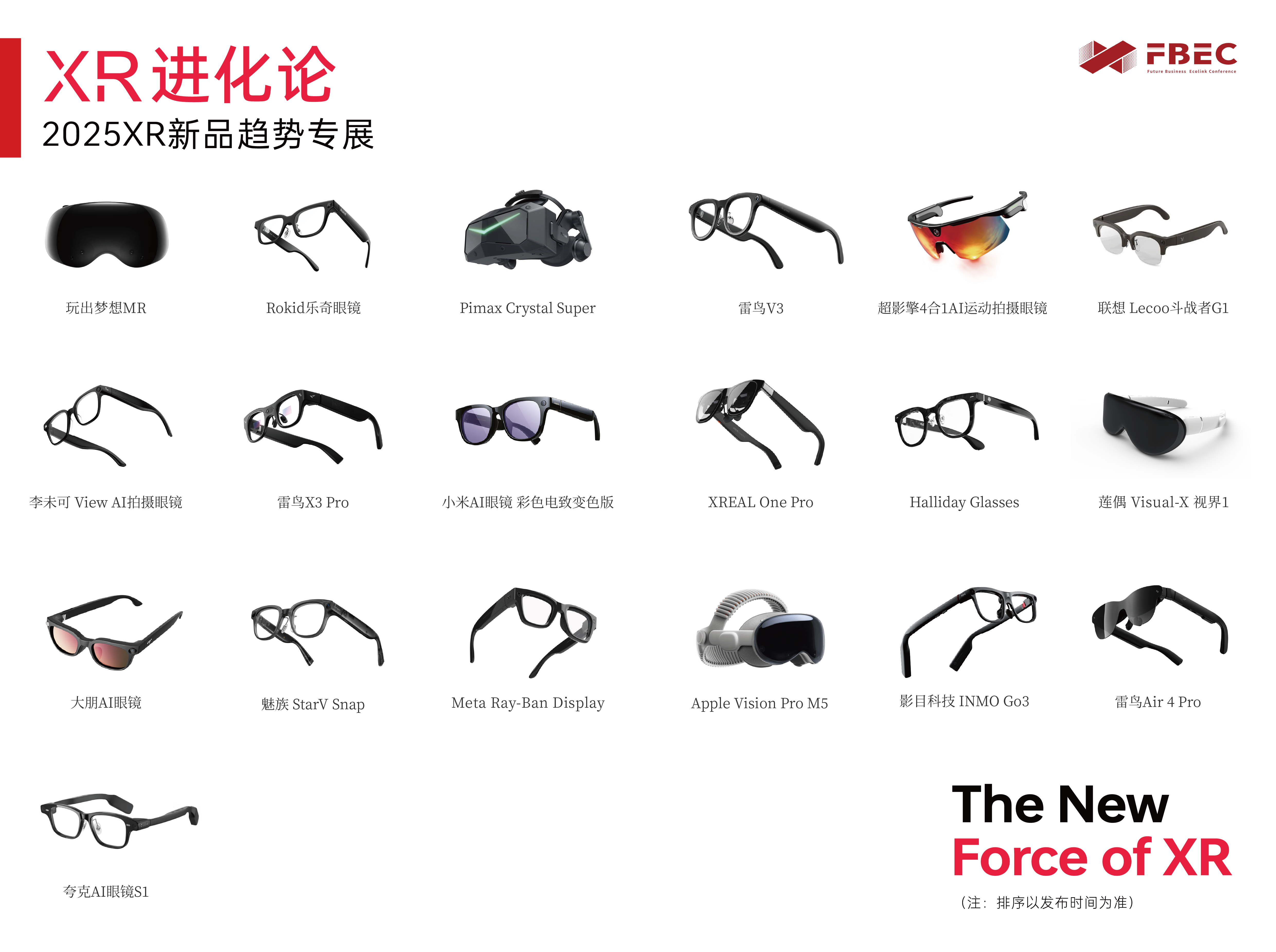 FBEC 2025 ,VR陀螺将联合多个品牌厂商,设置“2025 XR 进化论“展区,展示 Apple vision Pro(M5)、Meta Ray-Ban Display、雷鸟X3 Pro、夸克 AI 眼镜 S1、小米 AI 眼镜(电致变色款)等多款代表产业进化的海内外产品,让与会者用直观的方式感受行业技术的变革。