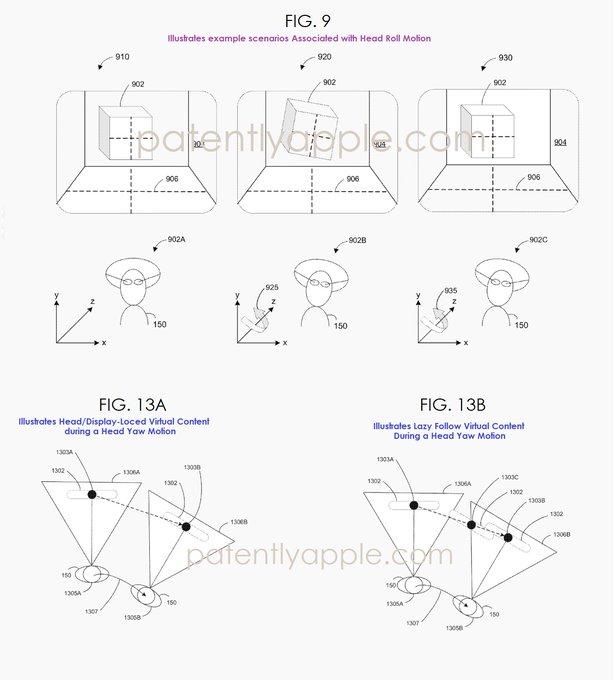 苹果获得了一项运动感知呈现引擎的专利,该引擎能够确保虚拟内容在用户头部运动时保持舒适的观看体验,从而减少XR体验中的抖动、恶心和视觉疲劳。该系统能够检测用户的姿势变化,并动态调整内容的呈现方式:在头部运动幅度较小时锁定头部,在头部偏离或俯仰运动时采用“lazy follow”模式,在头部大幅度运动时采用“重力对齐”模式——同时应用平滑处理、边界和外观调整,使用户界面保持清晰易读,避免出现卡顿或抖动感。