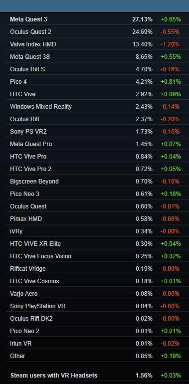 本月增幅最大的产品是PICO 4,上升0.81%,占比达4.21%。增幅排在第二和第三位的头显分别是Quest 3和Quest 3S。跌幅最大的头显为Valve Index,达到1.20%,受Quest 3/3S冲击明显,加上新一代Steam Frame头显的消息公布后,换代需求被放大。
