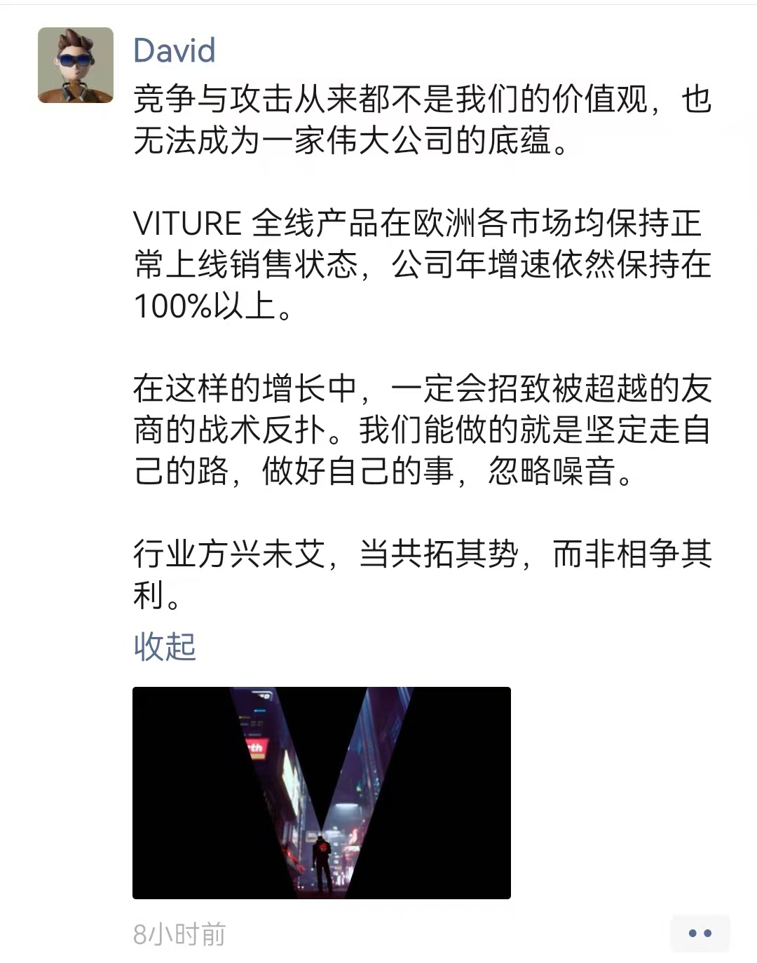 “竞争与攻击从来都不是我们的价值观,也无法成为一家伟大公司的底蕴。VITURE全线产品在欧洲各市场均保持正常上线销售状态,公司年增速依然保持在100%以上。在这样的增长中,一定会招致被超越的友商的战术反扑。我们能做的就是坚定走自己的路,做好自己的事,忽略噪音。行业方兴未艾,当共拓其势,而非相争其利。”