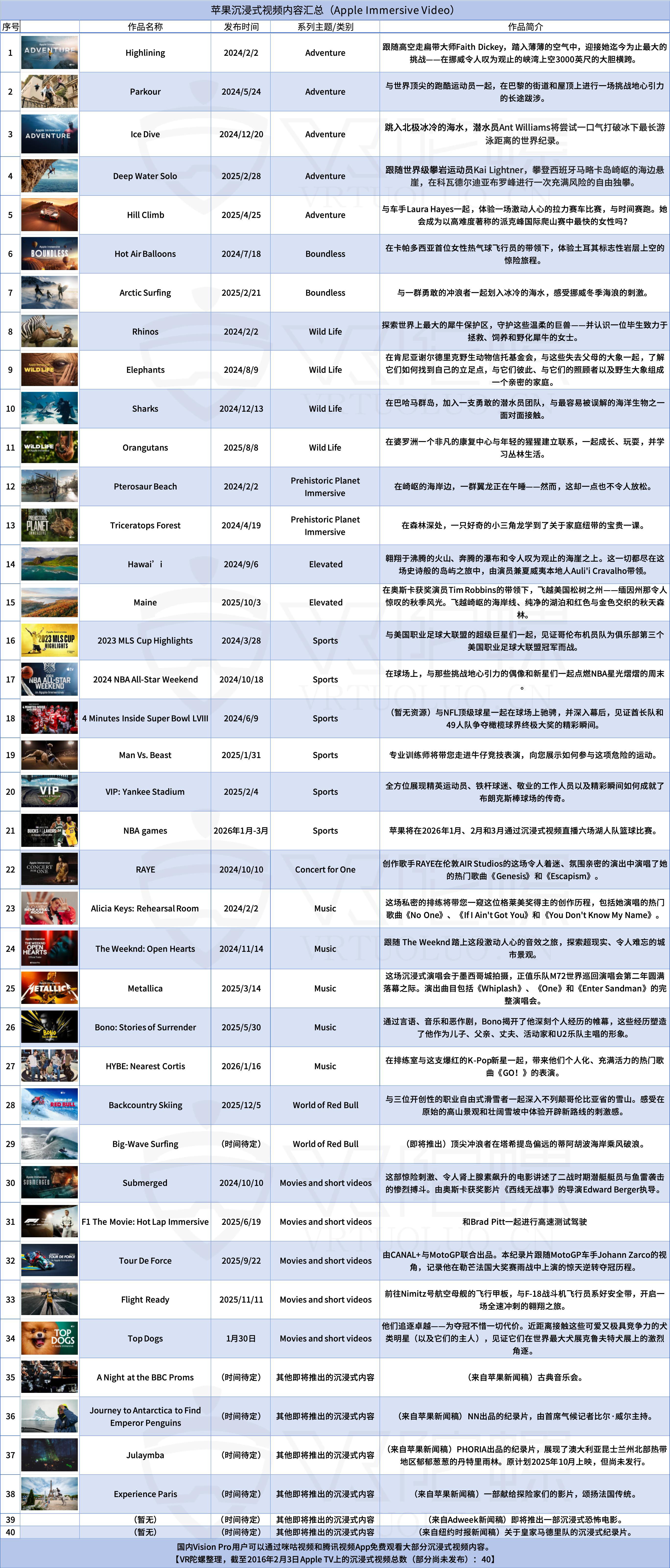 苹果Vision Pro发布两周年,根据VR陀螺的不完全统计,截至2026年2月3日,Apple TV上的沉浸式视频(Apple Immersive Video)总数为40部,包含已预告但尚未发布的视频。2025年内发布的苹果沉浸式视频有13部。