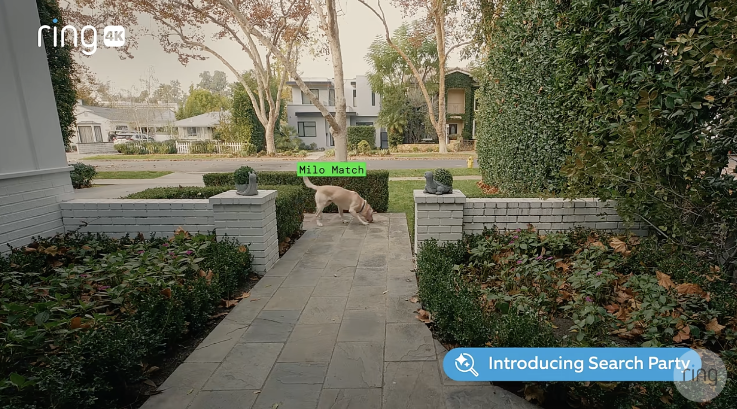 Ring 展示了其 “Search Party” 功能。该功能利用 AI 和社区网络识别丢失宠物的照片,并调用周边摄像头帮助失主寻回宠物。