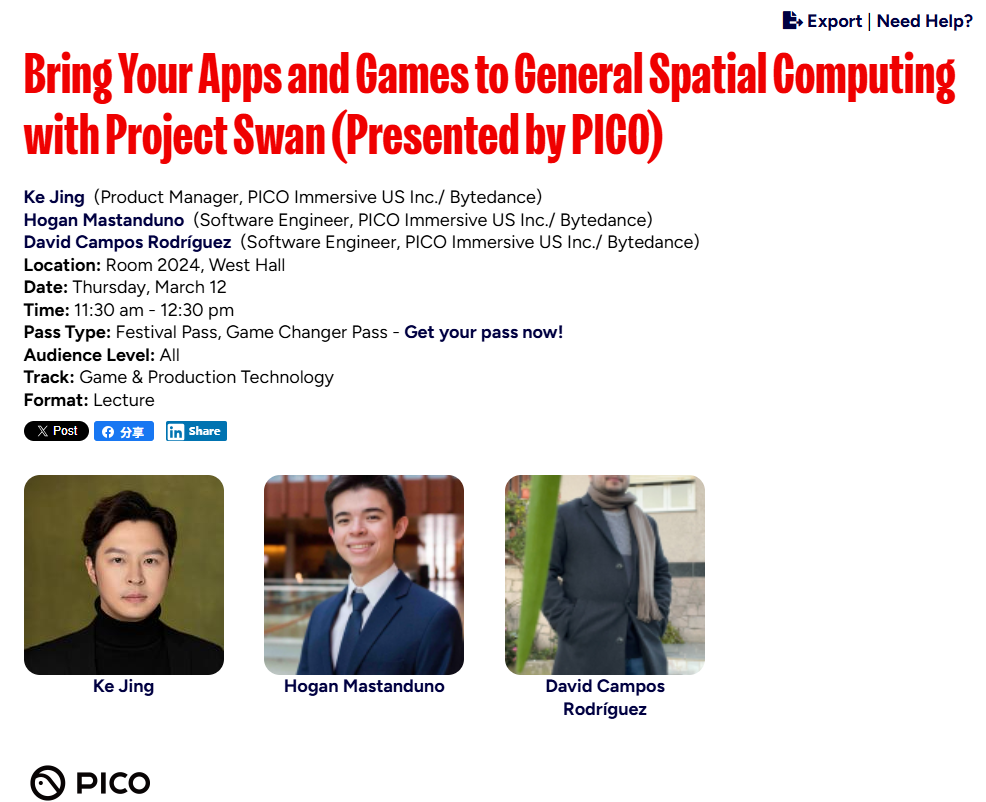 描述显示:“Project Swan是PICO面向通用空间计算的旗舰设备,旨在支持新一代全空间与共享空间体验。本演讲将介绍核心操作系统与平台能力,助力开发者——从XR专家到非XR应用、网页及游戏创作者——为这一新兴媒介构建或适配内容。它开创了游戏与应用共存的空间体验新范式,使主体验能在共享环境中与伴生应用并行运行。与会者将全面了解Project Swan的图形性能、多模态交互系统及开发工具链,并获得将现有应用或游戏迁移至空间计算工作流的实践指南。通过具体案例与现场演示,本环节重点展示原生应用开发者和游戏引擎用户如何立即着手构建通用空间计算内容。”
