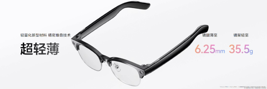 外观设计方面,华为 AI 眼镜通过采用全新的轻量化新型材料,该款眼镜的镜腿厚度据称被极致压缩至 6.25 毫米,整机重量仅为 35.5 克(不含镜片),相比目前大多数 AI 拍摄眼镜更轻。