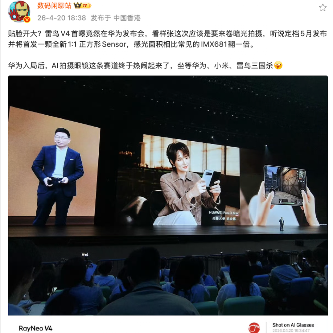 与此同时,据爆料,AI 眼镜品牌「雷鸟创新」将于 5 月举办发布会,并发布下一代 AI 拍摄眼镜一一雷鸟 V4,产品在外观、续航和影像上都有较大改进。