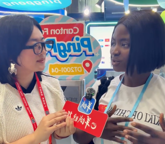 羊城晚报记者在广交会上佩戴亮亮视野AR翻译眼镜采访尼日利亚采购商Kiki